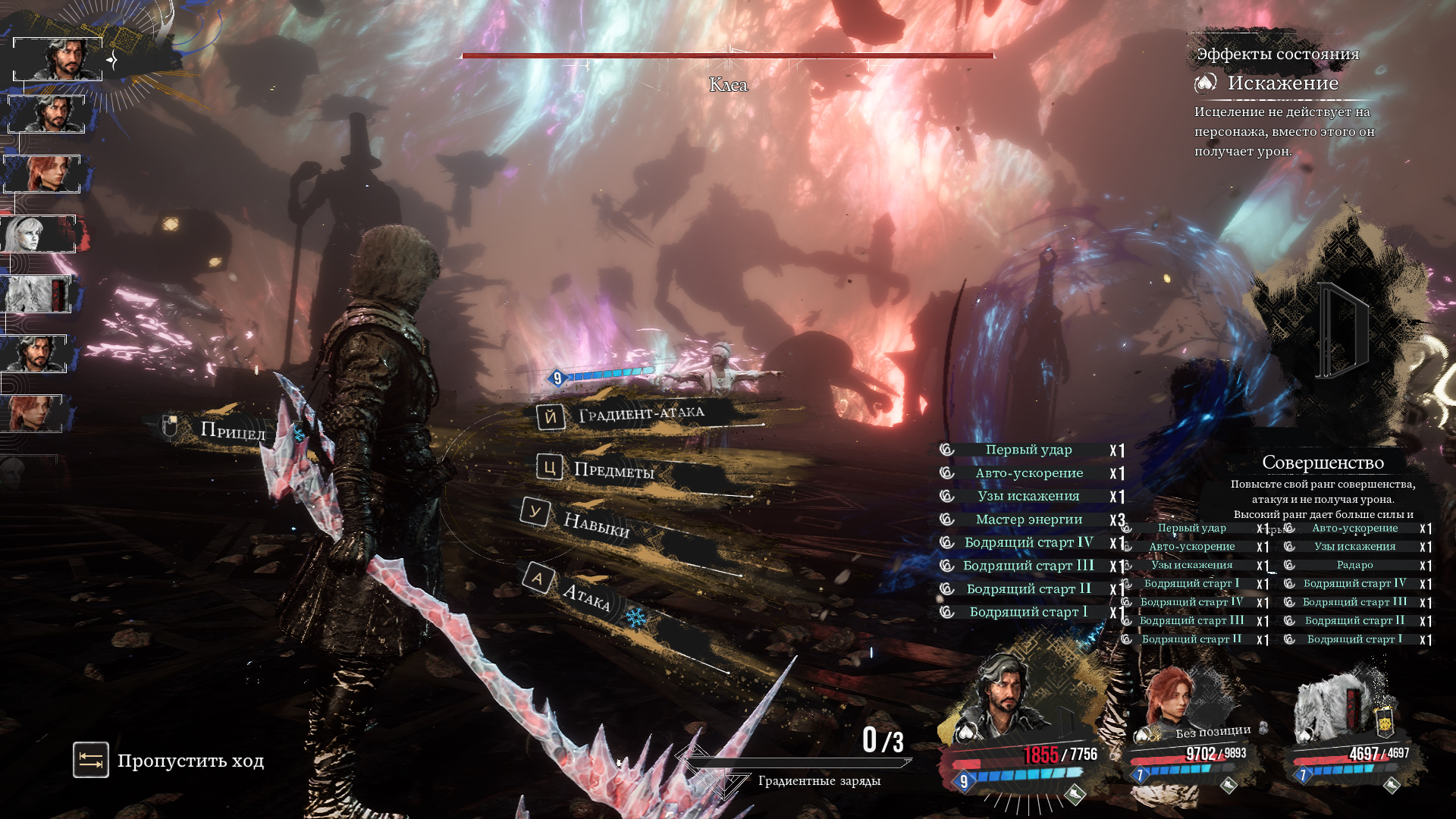 Когда он «накапливает невероятное хрому», последует мощная атака по всем участникам группы. Нажмите на нужную клавишу в тот момент, когда большой шар хромы начнет сжиматься внутрь, чтобы провести разрушительный контр-градиент. После того как здоровье опустится ниже половины, перед этой атакой он нанесет 2 обычных удара. Их тоже можно отбить: уклоняйтесь в момент сжатия сферы, затем на третьем ударе выполните контр-градиент.