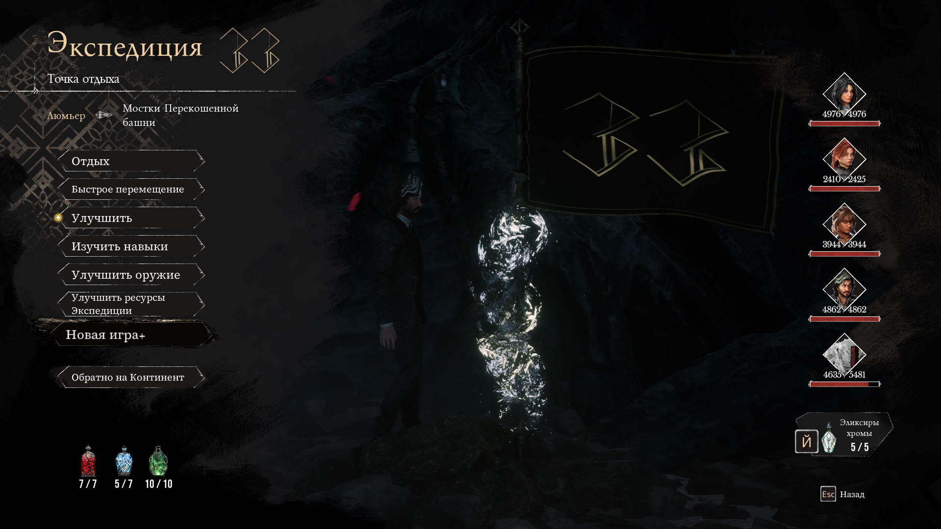 И, наконец, в самом углу на северо-востоке ищите вход в опасную локацию «Вороны». Подберите журнал Экспедиции 34 и активируйте флаг. Справа можно найти цвет люмины. Чтобы призвать опционального босса Хрома-шапелье, перестреляйте всех светящихся ворон. Самая опасная атака — удары топором. Наносит огромный урон, особенно тем, кто стоит сбоку. Запомните тайминги, лучше всего уклоняться, тем более последний удар требует прыжка, то есть контрудар будет от него, а не от парирования. Обычные атаки с замахом сверху легко парируются. Ориентируйтесь на звук. Когда появляются летающие маски, обязательно их расстреливайте. И да, не забывайте, что это летающий враг!