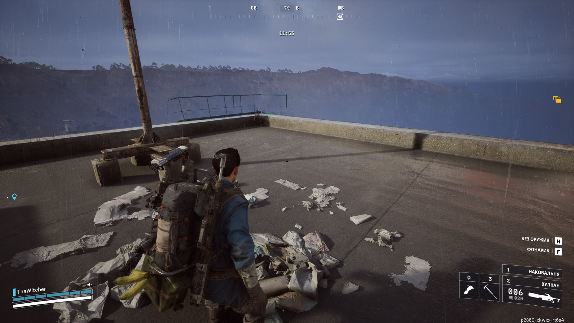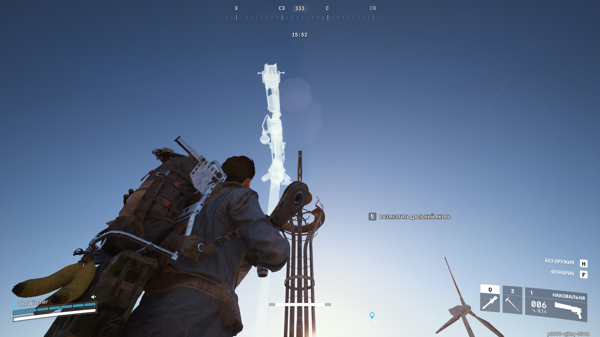 Чтобы на нее запрыгнуть, с восточной стороны поднимитесь на возвышенность соседнего здания и с разбега прыгните с деревянной доски на другую сторону. На крыше стоит высокая металлическая вышка. На нее-то вам и нужно взобраться. Достаньте зиплайн, прицельтесь, чтобы трос уходил на вершину, и переместитесь туда. Оказавшись сверху, обыщите тайник и найдите подставку под лазерный локатор.