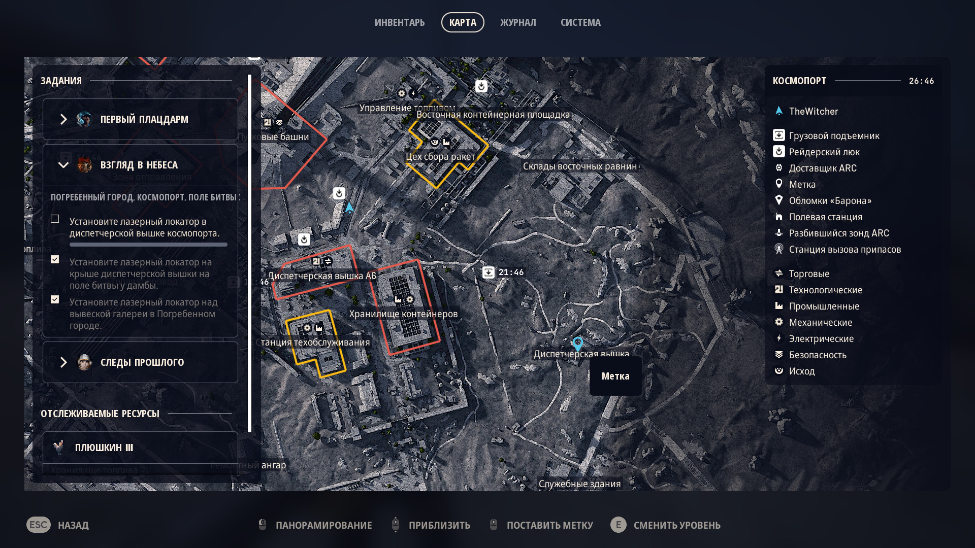 Третий пункт назначения — Космопорт. Вам нужно найти на карте диспетчерскую вышку. Но не A6, а другую, которая находится в юго-восточном углу карты, на востоке. На данной территории расположена большая металлическая вышка, на которую можно подняться по желтой лестнице. Так и сделайте, чтобы обнаружить подставку под лазерный локатор.