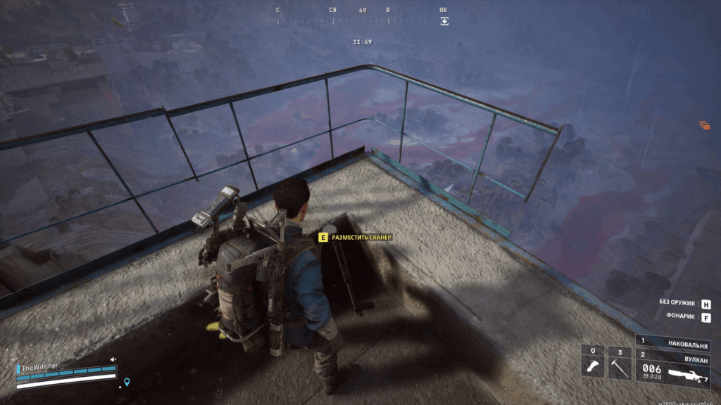 Чтобы на нее запрыгнуть, с восточной стороны поднимитесь на возвышенность соседнего здания и с разбега прыгните с деревянной доски на другую сторону. На крыше стоит высокая металлическая вышка. На нее-то вам и нужно взобраться. Достаньте зиплайн, прицельтесь, чтобы трос уходил на вершину, и переместитесь туда. Оказавшись сверху, обыщите тайник и найдите подставку под лазерный локатор.