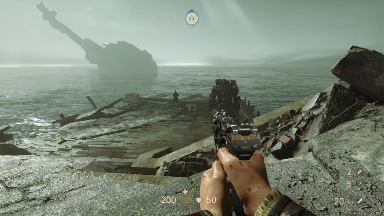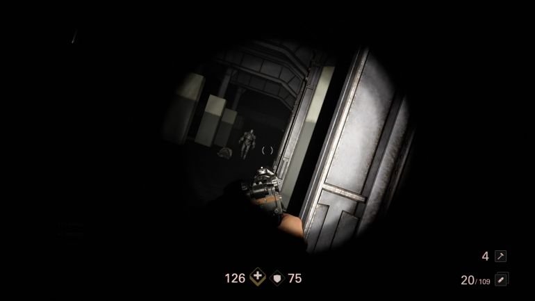 Кроме того, бункер полностью отключен от электричества. Все, что у вас будет — небольшой фонарик, освещающий область впереди. На протяжении всего уровня вы не будете понимать, куда нужно двигаться дальше — карта приведет вас к нескольким тупикам. Помимо роботов вы столкнетесь с механическими собаками. Кульминацией всего этого станет огромная комната, заполненная солдатами и двумя стационарными орудиями.