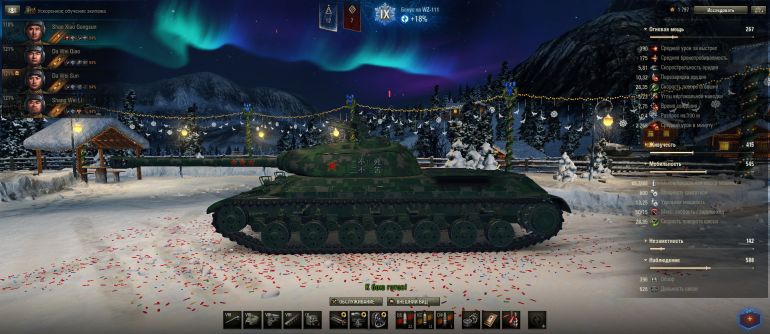 Динамика. Здесь у нас все прекрасно в отличие от конкурентов WZ-111, главным из которых является ИС-6. Наш танк имеет двигатель 12150L производства NORINCO мощностью в 600 л.с., разгоняющий нашу тушу массой в 44,5 т до 50 км/ч. Причем это реальные цифры, танк их набирает и держит! Скорость заднего хода составляет 15 км/ч. Удельная мощность — 13,48 л.с./т. Поворотливость — 26°/с.