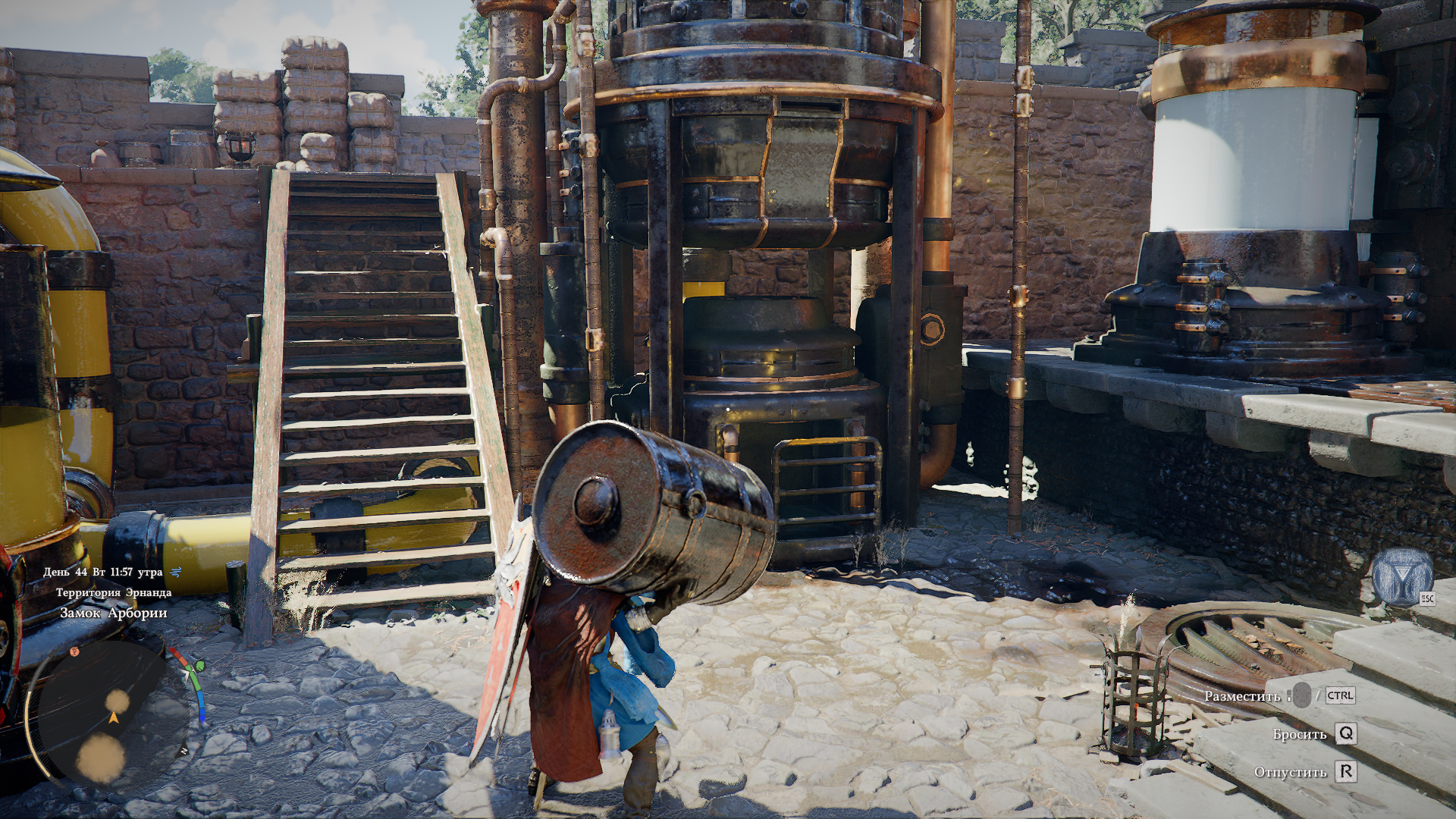 Отнесите ее к лестнице, по которой поднимались к вентилю управления дробилкой. Справа от лестницы есть тележка для бочки и огромный агрегат. Наведитесь на тележку через CTRL и поставьте клавишей R. При условии, что бочка с маслом находится в ваших руках.