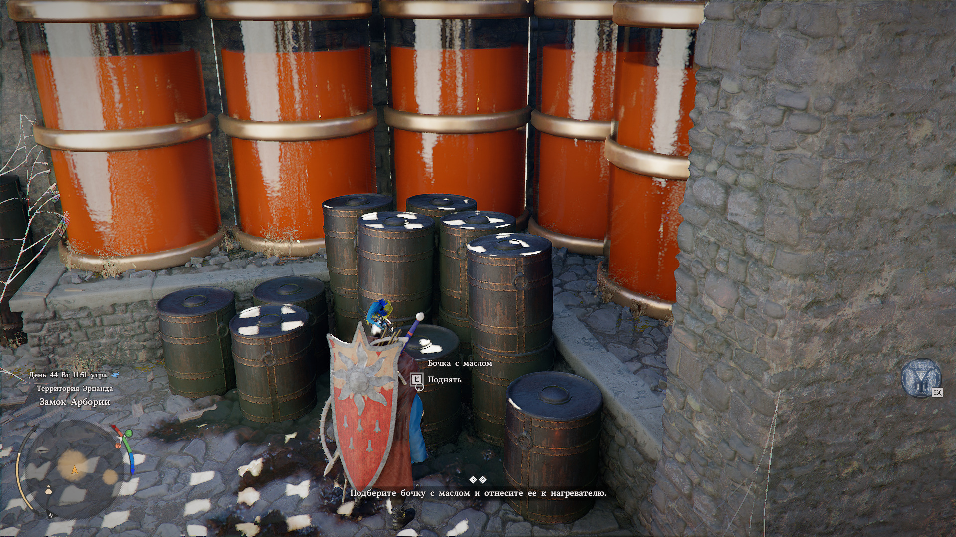 От маховиков на резервуарах пройдите через арку слева и возьмите одну из больших бочек с маслом.