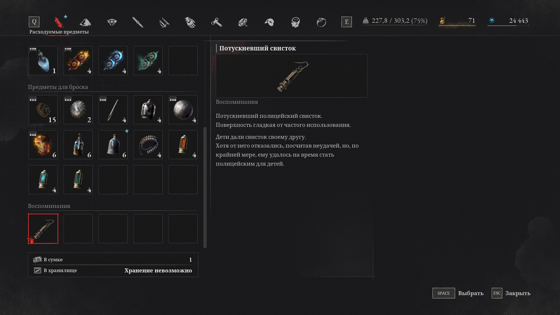 Если у вас нет потускневшего свистка в инвентаре, вернитесь в основную игру и найдите предмет: он лежит на скамейке со свечами рядом со звездочетом «Двор ратуши Крата».